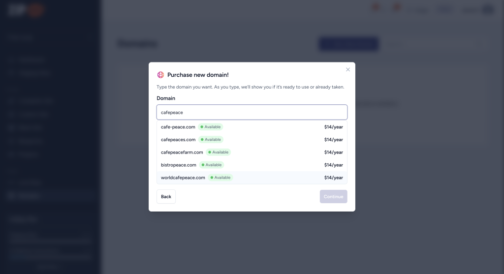 You can now purchase domains directly from ZipWP. No need to leave the platform or deal with third-party registrars.